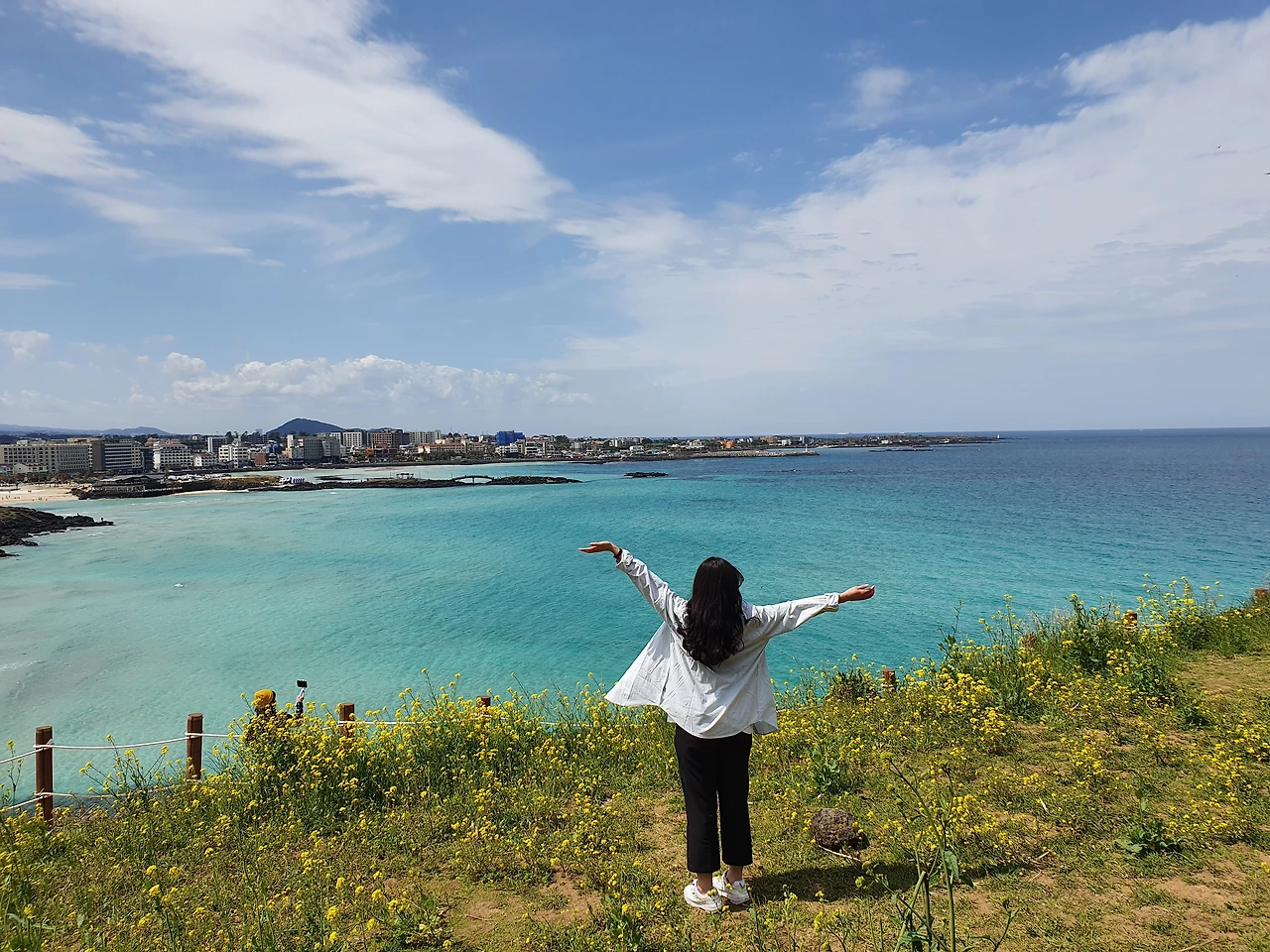 '양손을 쭉 뻗어주세요' 제주 도민이셨던 분은, 여행을 하며 사진을 찍고 있던 내가 귀여우셨는지 다양한 포즈로 예쁜 사진을 남겨주셨다. 낯을 가리는 성격상 누군가에게 부탁하는 일이 어렵게 느껴졌는데 이렇게 홀로 여행을 하면서 조금씩 노력을 하다 보니 조금은 부탁도 자연스러워지고 있다