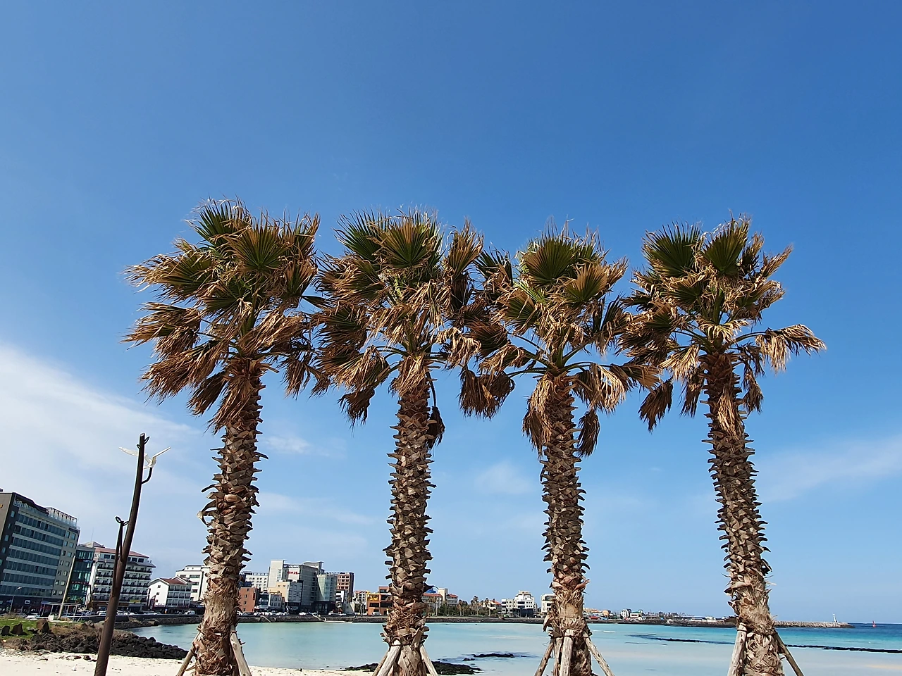 파란 하늘과 야자나무가 가득한 넓은 잔디밭. 옥빛 바다가 일렁이던 함덕의 바다를 보며 무거운 배낭의 무게가 느껴지지 않았다. 한자리에서 빙글빙글 돌기 시작했다. '세상에 이렇게 아름다운 곳이라니' 눈으로 보고 있지만 믿기지 않는 풍경이었다. 이른 오전, 아무도 없는 함덕해수욕장의 풍경은 나를 다시금 제주로 오게 만들었다