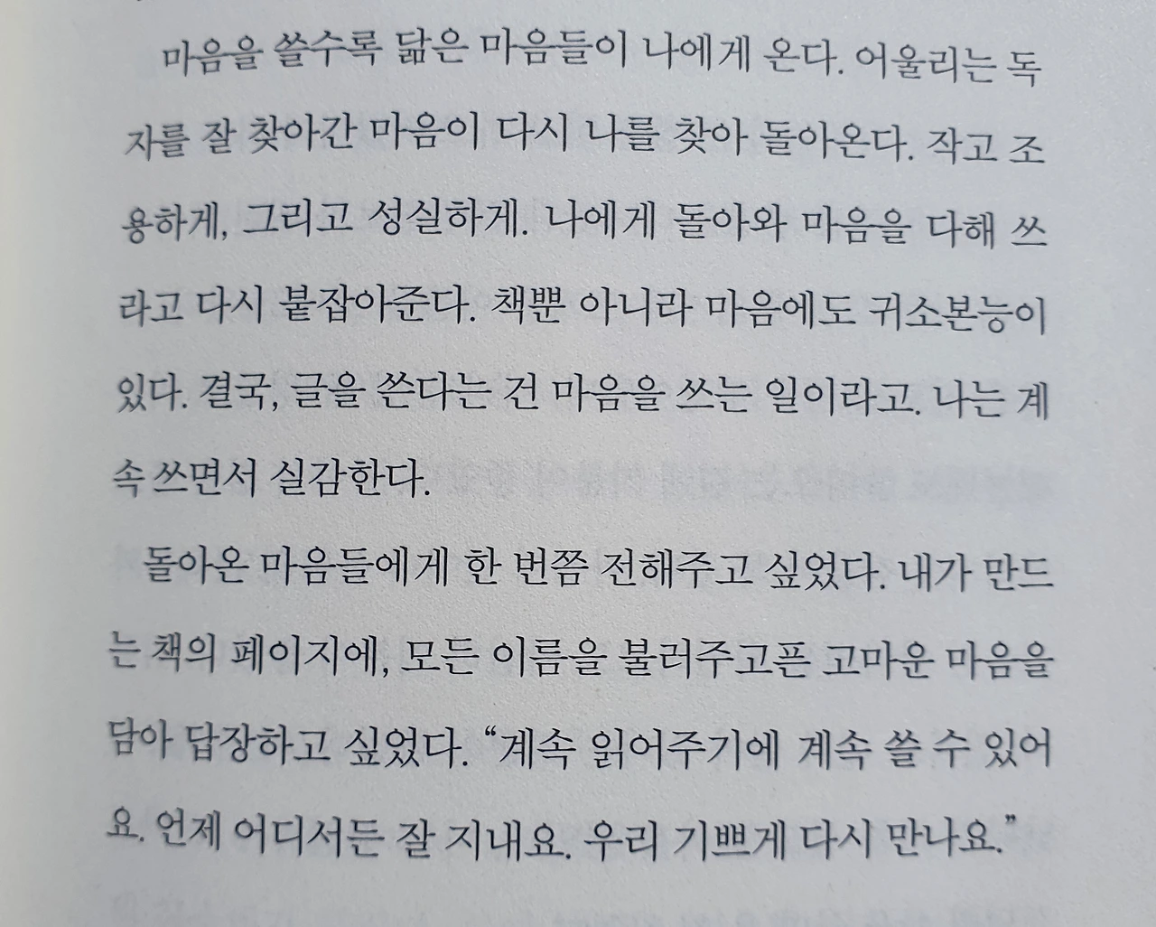 글쓰기에 관련된 꾸준히 읽어 왔지만, [마음 쓰는 밤]에서는 유독 마음이 느껴지는 문장들이 많아 멈춰 서서 나를 바라본다. '나는 왜 글쓰기를 하는 걸까?' 글쓰기로 큰 성공을 하고 싶다는 마음보다는 내가 살기 위해서 글을 쓴다. 마음을 잘 흘려보내기 위해 글을 쓰고, 기록된 마음이 누군가에게 닿아 작은 도움이 되기를 바라는 마음으로 쓴다