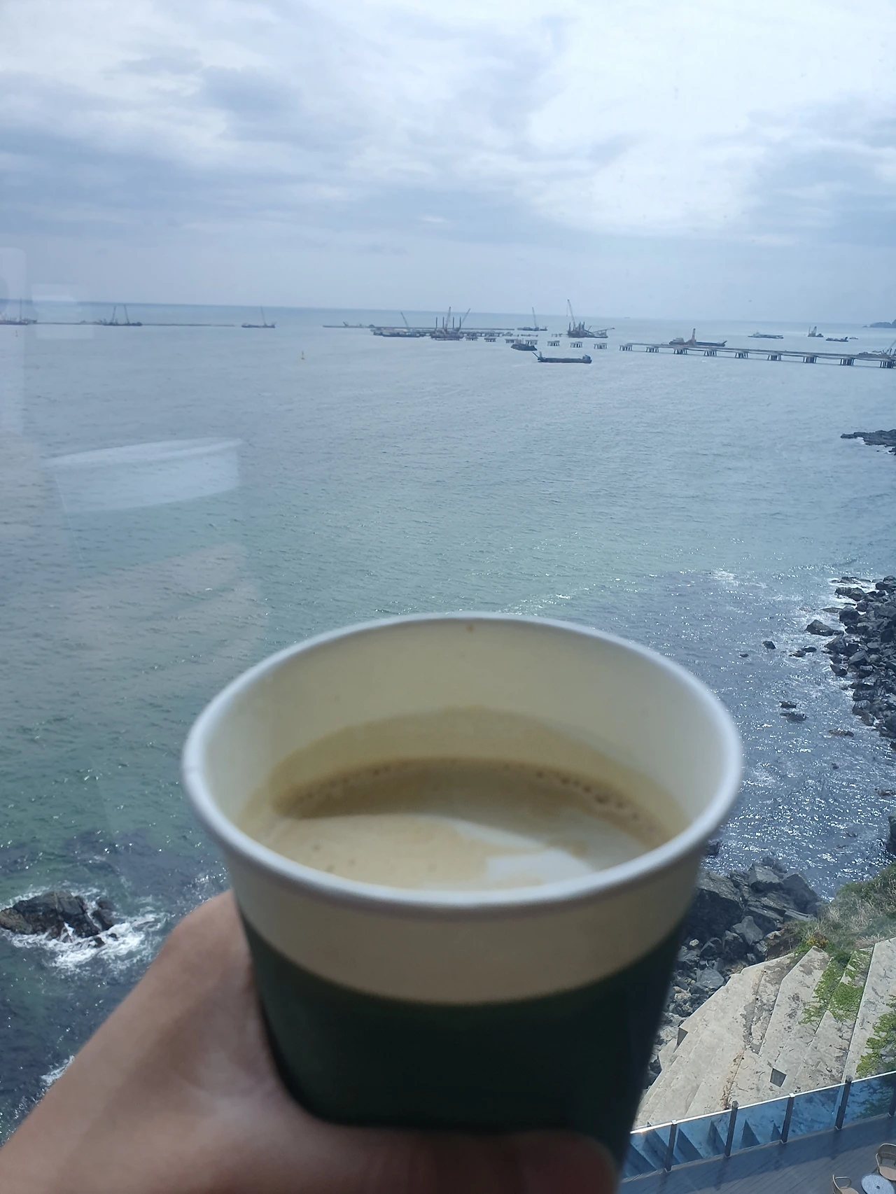 오늘 날씨는 흐림이지만, 아침의 작은 반짝임이 나를 웃게 만들었다. 모닝커피를 먹고 싶어서 사온 우유에 라떼를 만들었다. 넓은 창문으로 보이는 바다를 보며 먹는 커피, 오늘 이 순간의 감정에 집중해 보자며 다짐해 본다