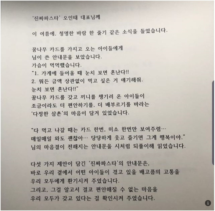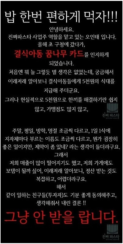 오인태 대표는 결식아동에게 끼니당 식대 5천 원(서울시 기준)을 제공하는 제도 ‘꿈나무 카드’의 존재를 알게 되었고 ‘현실적으로 5천 원으로 한 끼를 해결하기란 쉽지 않다’는 생각을 갖게 되었다. 그 후 결식아동들에게 돈을 받지 않고 식사를 제공하며 선한 일을 실천하고 있다.