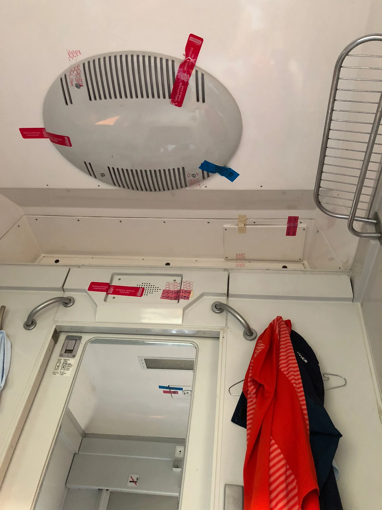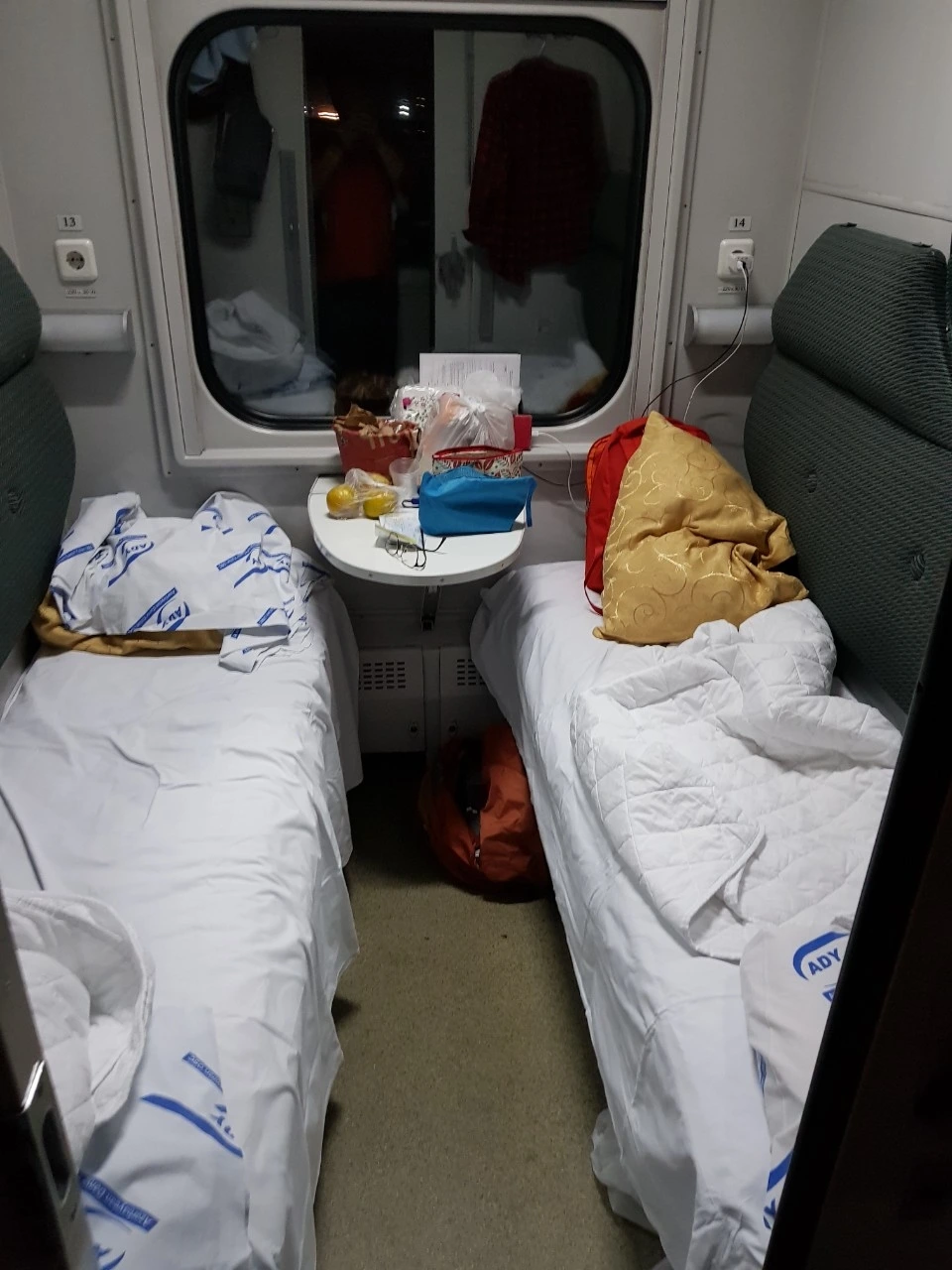 1평이 될까 말까 한 2인용 침대칸은 제법 유용하게 꾸며져 있었다. 군데군데 선반과 옷걸이도 있고, 충전용 콘센트, 취침등, 거울, 그리고 냉온방시설도 돼 있었다. 특이하게도 천장에 있는 냉방기와 바로 밑의 시설들을 빨갛고, 파란 박스테이프로 붙여 놓았다. 저게 떨어지지는 않을지 못내 의심스러웠고, 저렇게 붙여 논다고 해서 안 떨어질지 더 의심스러웠다. 영화에서 보던 것처럼 화려하고, 고급스러우면서 엔틱한 객실은 아니었다. 자리에는 깔고 덮을 침대보와 이불보, 그리고 베개보가 놓여 있었고, 짐은 침대 밑 공간에다 넣을 수 있게 돼 있었다.