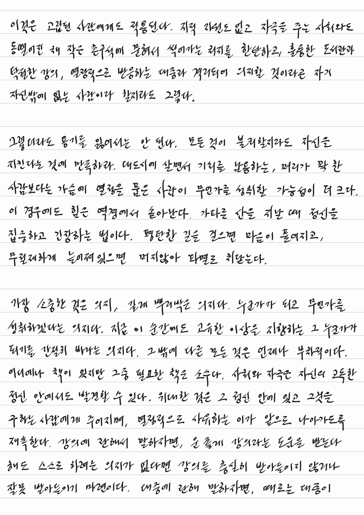 "가장 소중한 것은 의지, 깊게 뿌리박은 의지다. 누군가가 되고 무언가를 성취하겠다는 의지다. 지금 이 순간에도 고유한 이상을 지향하는 그 누군가가 되기를 간절히 바라는 의지다. 그 밖에 다른 모든 것은 언제나 부차적이다. 어디에나 책이 있지만 그중 필요한 책은 소수다. 사회와 자극은 자신의 고독한 정신 안에서도 발견할 수 있다. 위대한 것은 그 정신 안에 있고 그것을 구하는 사람에게 주어지며, 열정적으로 사유하는 이가 앞으로 나아가도록 재촉한다."
