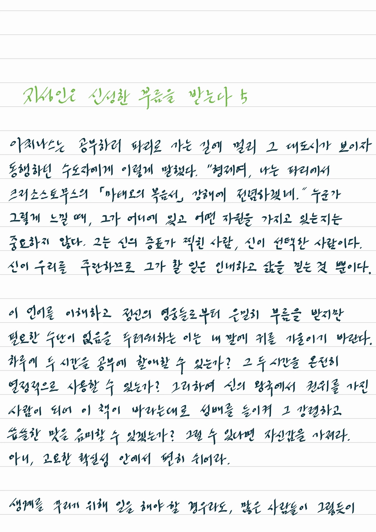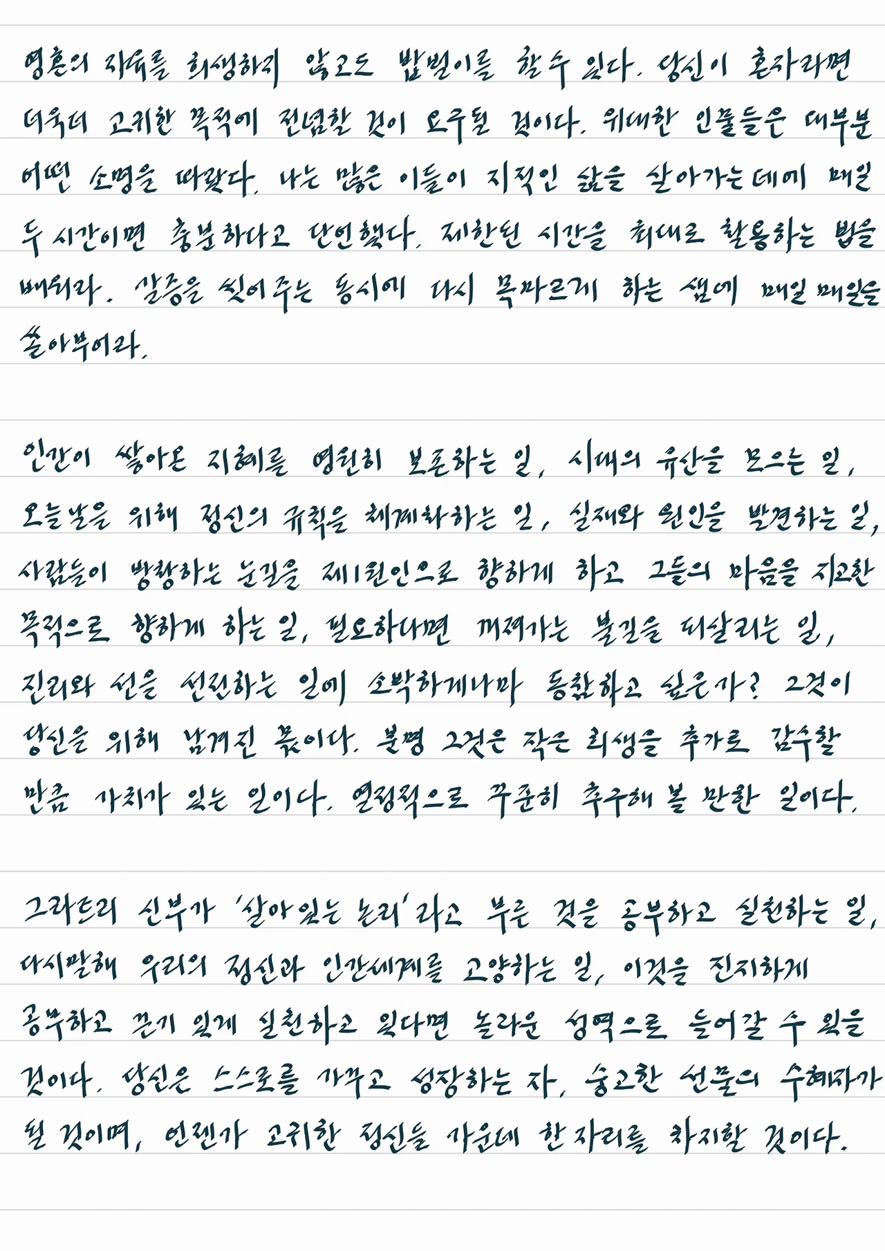 "하루에 두 시간을 공부에 할애할 수 있는가? 그 두 시간을 온전히 열정적으로 사용할 수 있는가? 그리하여 신의 왕국에서 권위를 가진 사람이 되어 이 책이 바라는 대로 성배를 들이켜 그 강렬하고 씁쓸한 맛을 음미할 수 있겠는가? 그럴 수 있다면 자신감을 가져라. 아니, 고요한 확실성 안에서 편히 쉬어라."