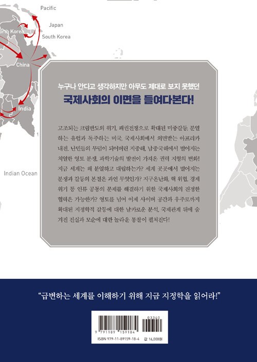 저자는 끊이지 않고 계속되는 분쟁과 내전, 급격하게 재편되는 세계질서의 중심에 지정학이 있다고 말한다. 패권 전쟁으로 확대된 미중 갈등, 분열하는 유럽과 독주하는 미국, 강도는 약해졌으나 전 세계에서 고착화되는 테러리즘, 난민들의 무덤이 되어버린 지중해, 남중국해에서 벌어지는 치열한 영해 분쟁과 국제사회에서 외면받고 있는 아프리카의 내전까지, 지금 세계가 직면한 모든 문제들의 본질을 제대로 바라보기 위해 지정학이라는 무기를 갖춰야 한다는 것이 저자의 주장이다.