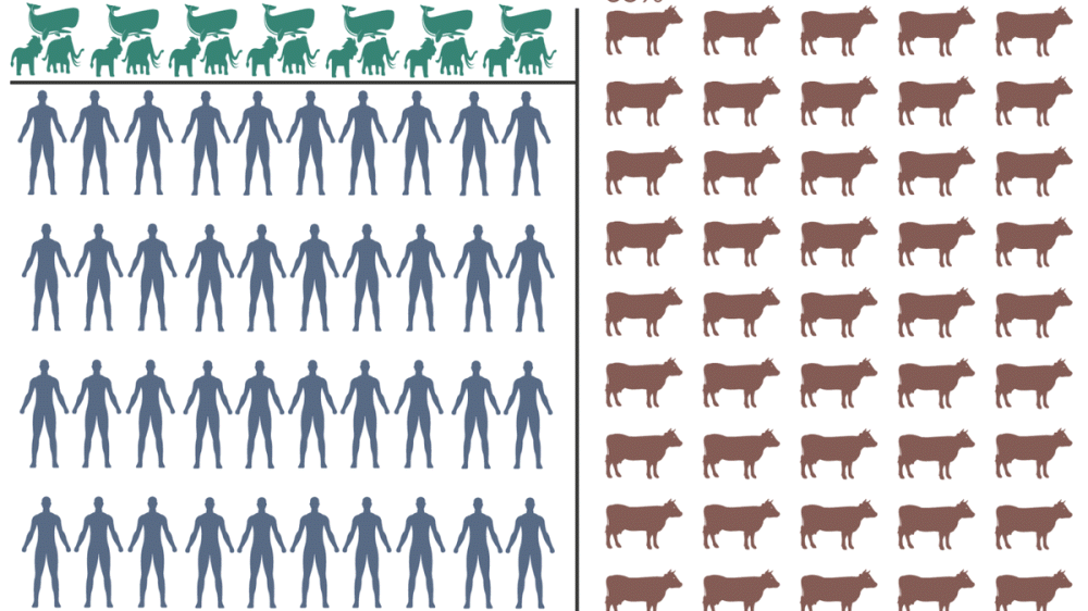 충격적인 것은 이뿐만이 아닙니다. 세계 포유류에서 야생동물이 차지하는 비율은 불과 4%에 불과합니다. 그렇다면 나머지 96%는 무엇이 차지하고 있는 걸까요? 인간이 34%를 차지하고 있고 나머지 62%는 가축입니다.4)