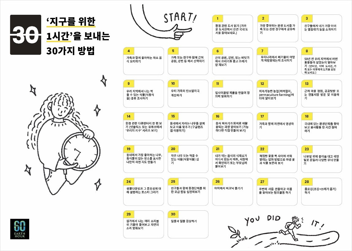 3월 23일 토요일 저녁 8시 반. 어스 아워 캠페인에 참여하기 위해 불을 끄고 가족들과 함께 오붓한 대화를 나눴습니다. 지구를 위한 한 시간이 가족을 위한 한 시간이 되었습니다. 항상 아침일 순 없죠. 해가 뜨면 언젠가 지기 마련이고 해가 지면 어두운 것이 자연스러운 일입니다. 그런데 언제부턴가 자연스러운 것이 불편한 일이 되어 버렸습니다. 밤이 되면 불을 끄고 쉬어야 합니다. 어둠이 평온과 안식을 가져옵니다. 그러니 시간이 되면 어둡게 지냅시다. 그것이 자연스럽습니다. 그것이 나와 지구를 편안하게 합니다. 여기 ‘지구를 위한 한 시간을 보내는 서른 가지 방법’을 소개합니다.1)