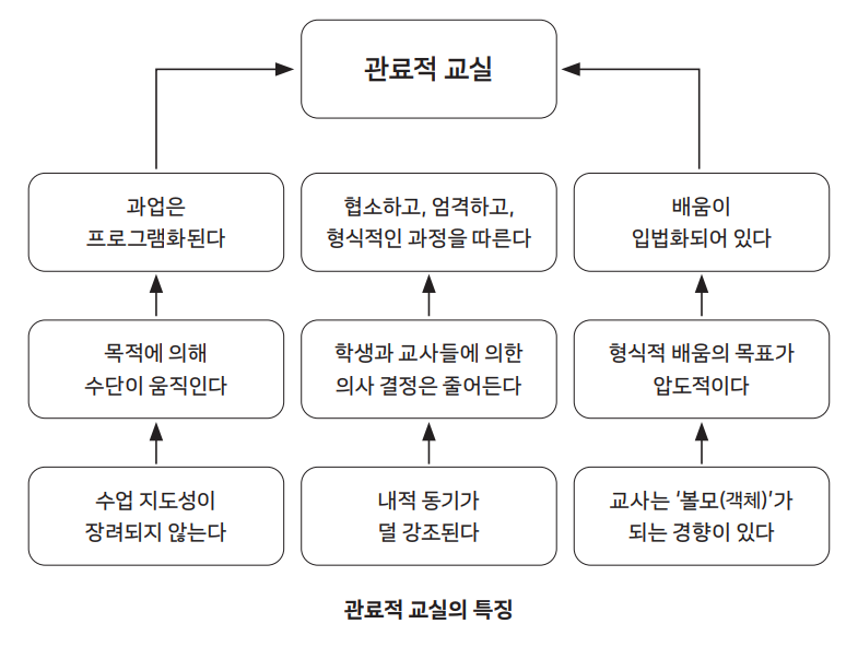 여기서 놓치지 말아야 할 것은 관료적 행정체계라는 것이 국가와 시·도교육청에만 해당한다고 착각해서는 안 된다는 점이다. Thomas J. Sergiovanni, Reginald Leon Green은 교실에서도 얼마든지 관료주의가 작동할 수 있다고 말한다.12)