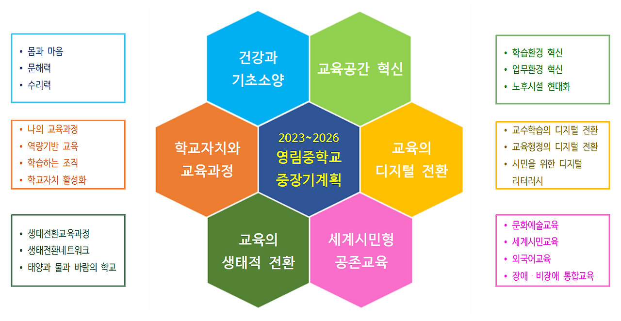 혁신학교 정책은 서울시교육청의 대표적 교육정책으로 서울시교육청 중기발전계획과 학교 중・장기교육계획 사이의 동조화는 그 자체로 혁신학교의 지속가능한 시스템을 구축하는 일이 된다. 이에 따라 영림중학교 중・장기교육계획의 시간 범위를 2023년부터 2026년까지 4년 단위로 변경하고, 교사와 학생(학부모), 교과와 학년을 넘나들며 중・장기적으로 추진해야 할 영림교육공동체의 통합과제로 ① 건강과 기초소양, ② 학교자치와 교육과정, ③ 교육의 생태적 전환, ④ 세계시민형 공존교육, ⑤ 교육의 디지털 전환, ⑥ 교육공간 혁신을 선정하였다.