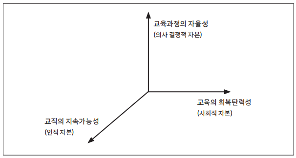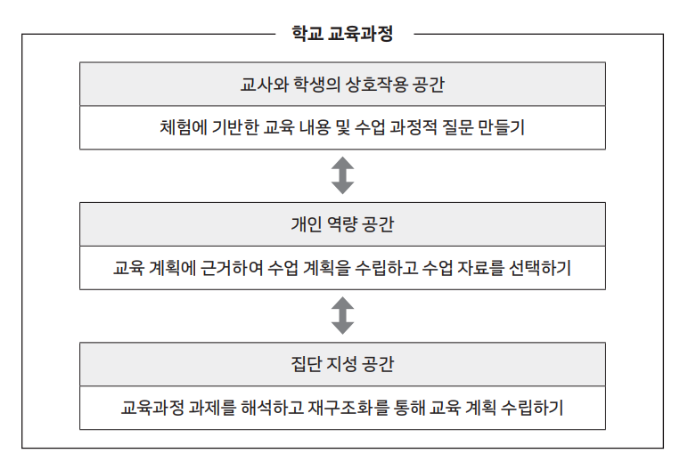 학교 교육과정은 다음과 같이 3가지 차원으로 구성된다.11) 먼저 하부 구조를 이루는 집단 지성 공간은 교사학습공동체의 역할이 이루어지는 공간이다. 이 단계에서는 학교 전체 교육 계획 속에서 교육과정의 책무를 확인하고 해석하는 과정이 펼쳐진다. 또한 교육의 시장화에 공동으로 대처하고 지역사회의 다양한 집단들을 포용하는 공동의 리더십을 창출하는 공간이기도 하다.