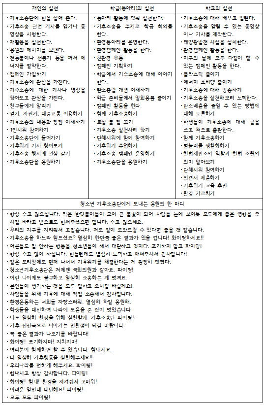 ‘역사적인 기후 소송, 우리는 무엇을 할 수 있을까?’라는 질문을 통해, 학생들이 개인적으로 실천할 수 있는 것들, 학급(동아리)에서 실천할 수 있는 것들, 학교 단위에서 실천할 수 있는 것들에 대해서도 토의해 보았다. 그 결과, 개인의 실천으로는 ‘재활용 실천하기’, ‘전등이나 선풍기 등을 꺼서 에너지 절약하기’, ‘기후 위기를 친구들에게 알리기’, ‘걷기, 자전거, 대중교통 이용하기’, ‘1인시위 참여하기’ 등이 제안되었다. 학급(동아리)의 실천으로는 ‘환경캠페인 활동하기’, ‘학급 준비물에서 일회용품 줄이기’, ‘시위에 함께 참여하기’ 등이, 학교의 실천으로는 ‘기후 소송에 대해 가르치기’, ‘ 태양광발전 시설 설치하기’, ‘탄소배출을 줄일 수 있는 방법에 대해 토론하기’, ‘환경 가르치기’ 등이 언급됐다. 끝으로 기후 소송에 참여하고 있는 또래 학생들에게 보내는 응원의 한마디도 요청했다.2)