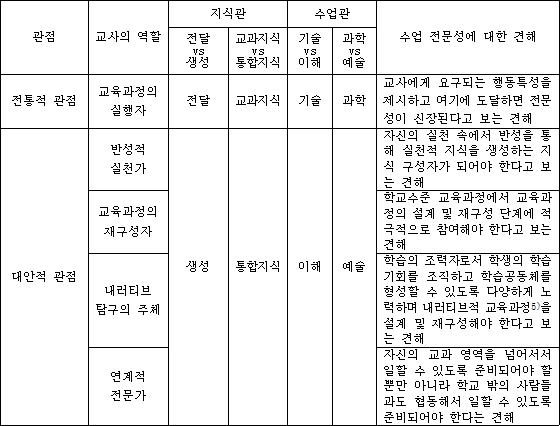 진영은과 함영기는 수업 전문성의 개념을 기술적 합리성에 기초하여 교과지식 및 수업기술의 연마를 핵심으로 하는 ‘전통적 관점’과 수업의 복잡성, 역동성, 학습자와의 상호작용 등의 개념에 대한 중요성을 강조하는 ‘대안적 관점’으로 나누고 이를 표 1과 같이 유형별로 범주화하여 수업 전문성에 대한 통합적 이해의 바탕을 마련하고자 하였다. (2009: 56-63)