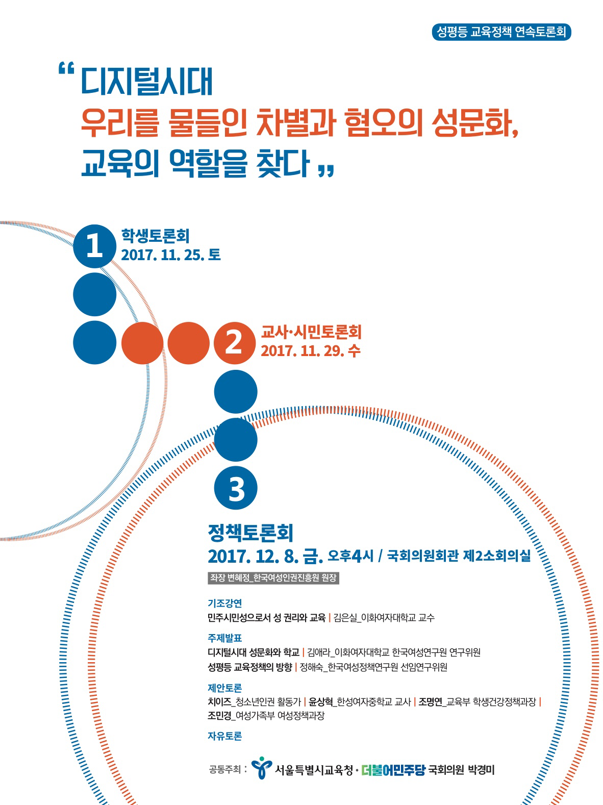 ‘디지털 시대의 차별과 혐오의 성문화’를 심각하게 받아들여야 하는 까닭은 SNS라는 사이버 공간을 통해 차별과 혐오가 공진화하고 재창조 된다는데 있습니다. 이에 반해 학교의 시간과 공간은 여전히 선형적입니다. 아무리 훌륭한 성평등 정책이 만들어지더라도 교육과정에 삽입하고 공문을 통해 학교로 내려 보내는 방식으로는 성공적으로 대응할 수 없습니다.