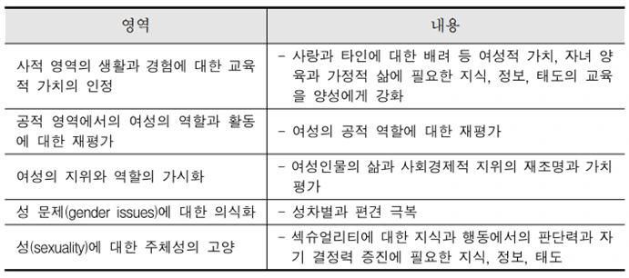 먼저 교육과정에 대하여 생각해보겠습니다. 일반적으로 교육과정은 세 가지 의미를 지닙니다. 첫째, 2015 개정 교육과정처럼 ‘문서화된 교육과정’입니다. 이때의 교육과정은 교과들의 목록이나 교과별, 학년별 교수 내용의 체계를 의미합니다. 둘째, 학교에서 ‘교육계획’에 따라 일정한 교과목을 가르치는 것을 지칭합니다. 이때의 교육과정은 학생의 입장에서는 학습해야 할 내용이고 교사의 입장에서는 가르쳐야 할 내용이 됩니다. 셋째, 가장 포괄적인 의미로는 ‘학습 경험의 총체’를 뜻합니다. 즉, 학생들이 학교생활을 하면서 갖게 되는 의도되고 계획된 경험이 곧 교육과정이라는 것입니다. 그런데 우리가 무엇을 가르쳐야 할 것인가에 대해서는 이미 정리가 다 되어 있습니다. 예를 들어, 정해숙 선생님께서 쓰신 <초중등학교 양성평등교육 활성화 방안>과 같은 보고서에 교육과정에서 성평등이 어떻게 다뤄져야 할지에 대하여 일목요연하게 제시하고 있습니다.