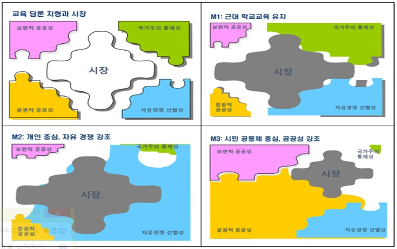 즉, '시장'이라는 변수로 x축을 구성하고 '국가'라는 변수로 y축을 구성하여 국가주의(제1사분면), 국가중심 공공성(제2사분면), 분권적 공공성(제3사분면), 자유경쟁(제4사분면)이라는 4가지의 영역을 설정하고 이름 바탕으로 한국 사회의 교육담론 지형을 [그림 6]과 같이 세 가지 유형으로 도식화 하였습니다.