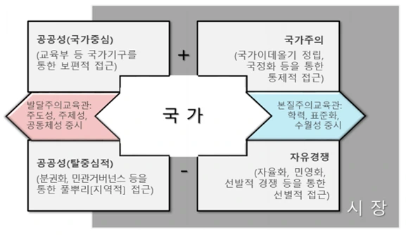 2018년 한국교육개발원에서도 비슷한 연구가 진행되었는데요. 국가의 역할을 보는 관점에 따라 한국사회에서 진보와 보수의 교육관을 [그림 5]와 같이 재배치하였습니다.11)