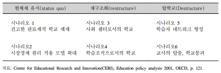 여기서 잠시 OECD에서 예측한 학교의 미래를 살펴보겠습니다. OECD는 학교교육에 대한 미래 시나리오에서 현체제 유지(Status quo), 재구조화(Restructure), 탈학교(Destructure)의 3가지 범주로 구분하고 각각의 범주를 다시 2가지로 구분하여 아래의 표와 같이 총 6가지의 미래 시나리오를 제시한 바 있습니다. 이 중에서 공공적 관점에서 학교의 변화와 개혁을 강조하는 재구조화 시나리오를 주의 깊에 살펴볼 필요가 있습니다. 재구조화 관점에서 교육은 학교에서만 이루어지는 것이 아니기 때문에 타 영역과의 연계의 중요성이 부각됩니다. 학교는 사회 센터로서 타 영역과의 연계에서 핵심적인 역할을 수행하는 혁신적인 모습을 지니거나9), 다양한 방식의 학습이 가능한 학습 조직으로 탈바꿈될 수 있습니다.10)
