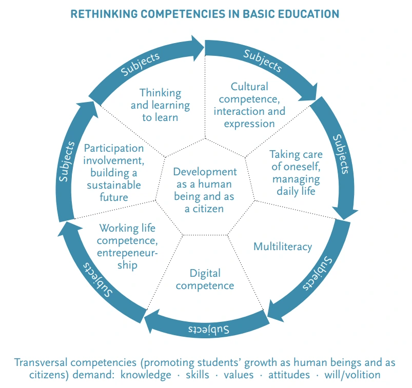 할리넨은 가르침과 배움에 대한 융합적 접근을 강화하는 것이 교육과정 개정의 또 다른 목표라면서 이러한 접근은 학생들이 학교에서 배우는 과목들과 학교 밖의 삶의 현상들 사이의 관계성과 상호관련성interdependecies을 파악하게하기 위한 것이라고 말했습니다. 이러한 접근은 학생들이 서로 다른 과목에서 창출되는 지식과 기술을 배움의 구조와 연결시켜 의미 있는 총체로 만들어낼 수 있게 돕습니다. 이를 통해 학생들은 새로운 질문을 만들어내고 새로운 지식을 창조하게 됩니다. 핀란드 국가 핵심 교육과정에서 융합적 역량(transversal competencies)은 지식, 기술, 가치, 태도, 의지로 구성되는 총체이며, 주어진 상황과 맥락에 지식과 기술을 적용할 수 있는 능력을 의미합니다. 융합적 역량은 다음과 같이 7가지 범주로 나누어집니다.