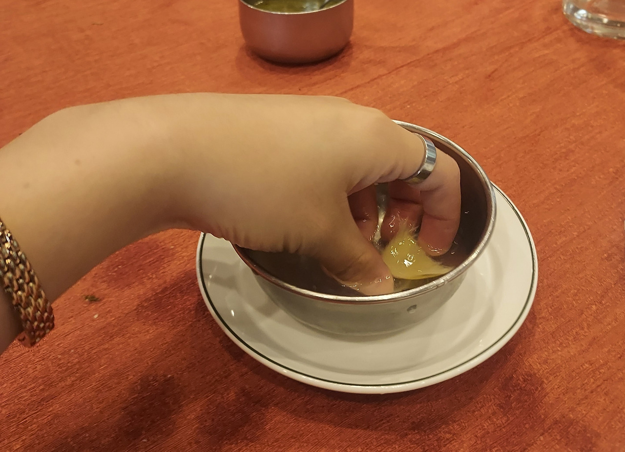 그렇게 무참하게 손으로 카레를 흡입했다. 여전히 손에 남은 미끈미끈한 카레들의 감촉에 한참 빠져있는데, 때마침 한 인도 측 직원이 내 앞에 자그마한 레몬 한 조각이 담긴 따뜻한 물 한 사발을 내어주었다. 여러 가지 카레를 맛보며 텁텁해진 입 속을 달래기 위한 개운한 후식이겠거니 하고 시원하게 한 입 들이키려 하자 내 앞에서 손으로 카레를 즐기는 방법을 알려준 교수가 손사래를 치며 말리는 게 아닌가.