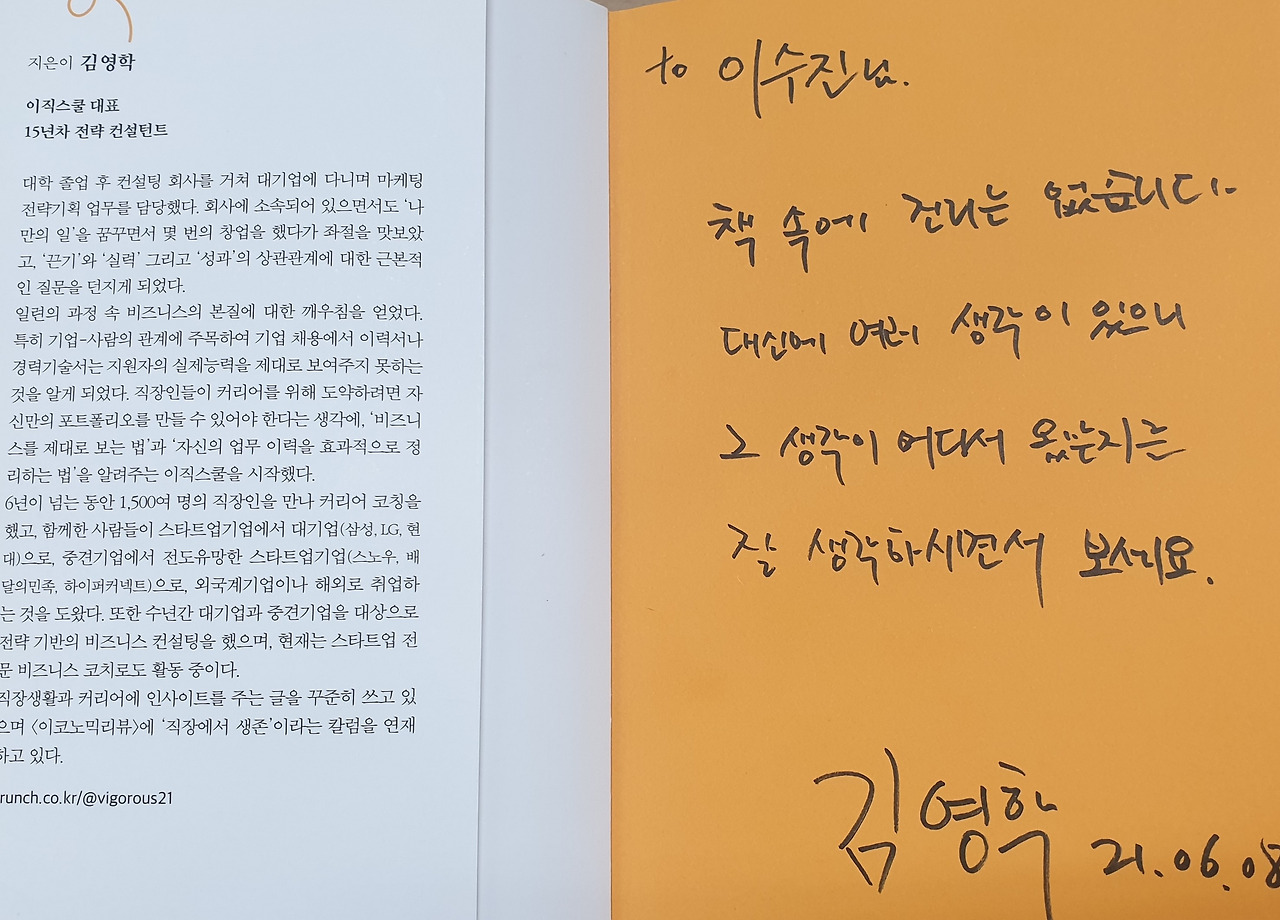 이런 질문들이 매번은 아니어도 자꾸 생각해보려 애쓰는 노력들로 일을 대하는 나를 다르게 만들어 주고 있다. 적어도 나 스스로는 변화에 대한 방어와 부정의 시간을 지나 서서히 받아들이고 있음을 느낀다. 비단 도서 때문은 아닐 수 있으나 도서의 내용을 여러 번 읽다 보면 그 내용이 어제, 오늘 다르다. 아직 뭐라고 딱 꼬집어 얘기할 순 없지만 같은 내용에도 깨달음의 지점이 달라진다. 그래서 작가가 써준 멘트가 더 뇌리에 남는다.