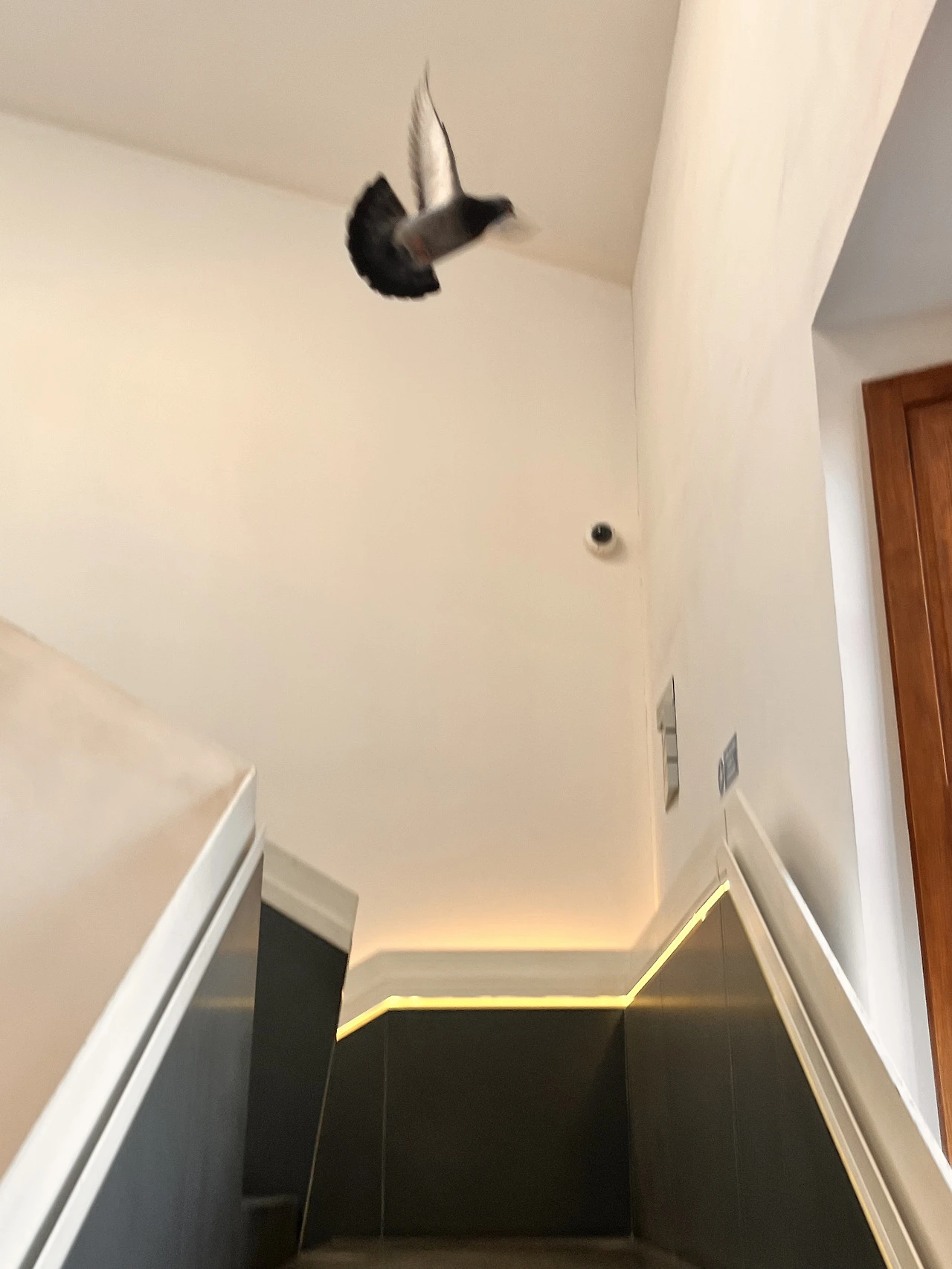 비둘기는 투명한 유리벽을 보지 못한 채 머리를 세차게 부딪쳤다. 소리가 날 때마다 녀석은 더 크게 당황하며 다시 날아올랐고, 같은 벽에 부딪히기를 반복했다.