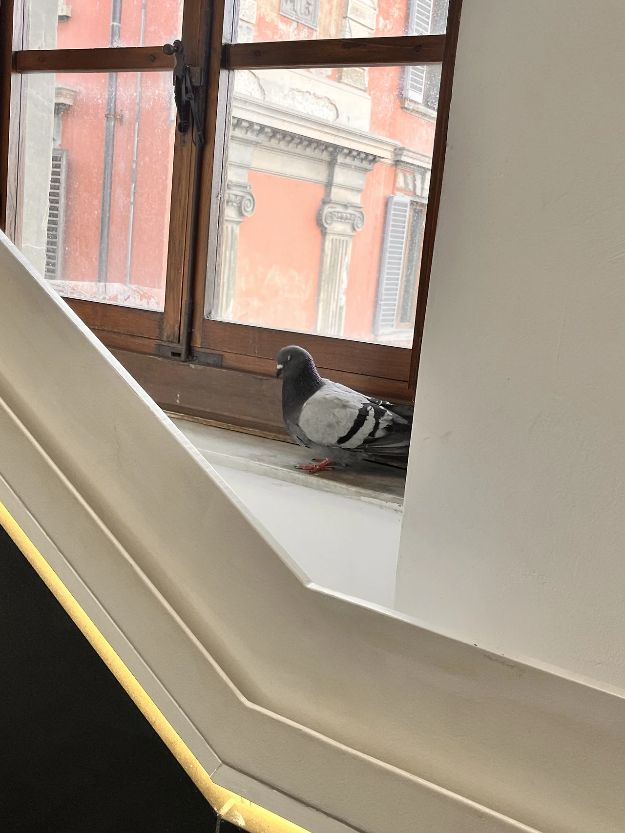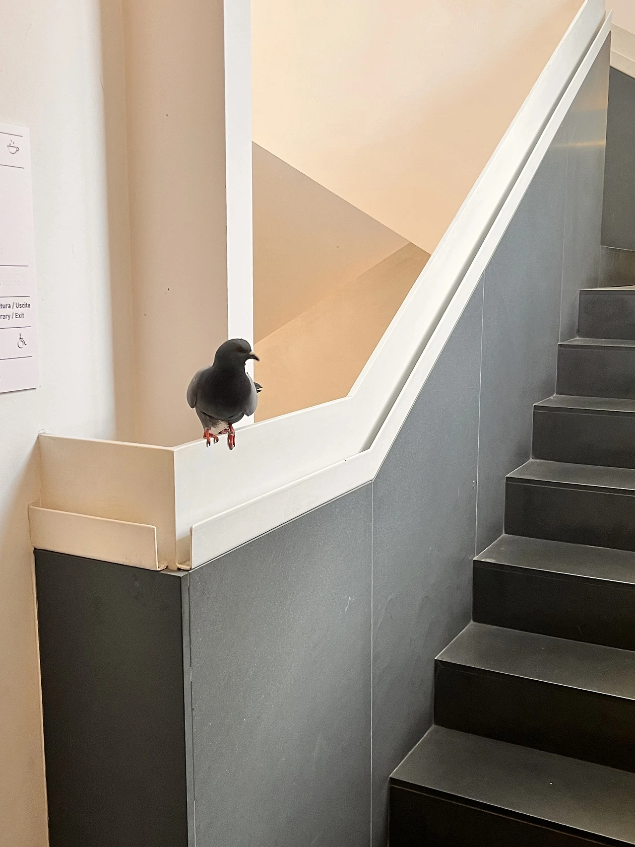 전시실을 나와 옥상 테라스로 향하는 좁은 계단실에 들어섰을 때였다. 어디선가 들어왔는지 회색 비둘기 한 마리가 유리 난간 위에 가만히 앉아 있었다.