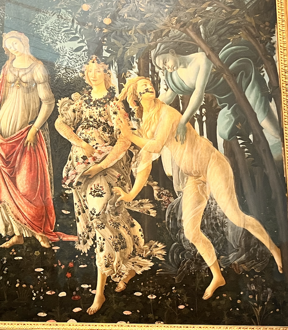 맞은편 〈프리마베라(봄)〉로 시선을 옮기면 사유의 농도는 한층 더 짙어진다. 이 그림은 500여 종의 꽃이 세밀하게 그려진 '아름다움의 정수'로 알려져 있지만, 화면 오른쪽에서는 명백한 사건이 벌어지고 있다. 푸른 피부를 가진 서풍의 신 제피로스가 숲의 요정 클로리스를 낚아채는 순간, 그녀의 입에서는 꽃이 쏟아져 나온다.