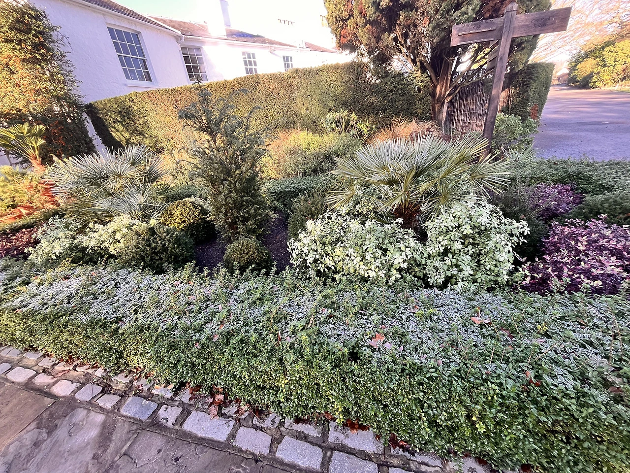 펨브르크 로지에 가까워질 즈음, 구름이 잠깐 갈라졌다. 뒤편에서 해가 살짝 고개를 내밀자, 잘 다듬어진 관목 위에 얹혀 있던 서리가 반짝이다가 물방울로 천천히 풀리고 있었다. 입구의 하얀 벽이 먼저 눈에 들어왔다. 밤비가 남긴 물기 때문에 유리처럼 반짝였고, 우리는 그 위를 조심스레 디뎠다.