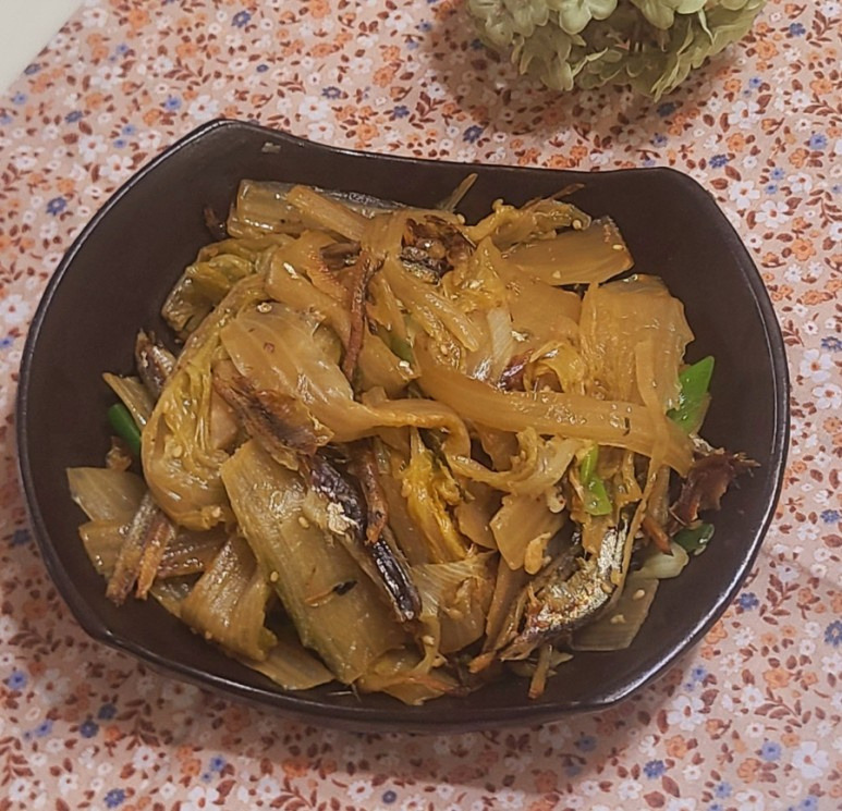 멸치 중자(대자도 좋다) 크기로 15마리 정도, 묵은지 반포기, 마늘, 대파, 맛술, 국간장, 들기름을 준비하고.