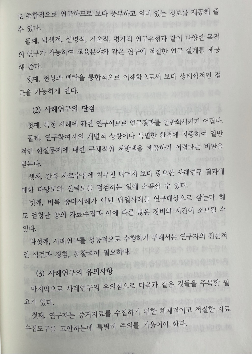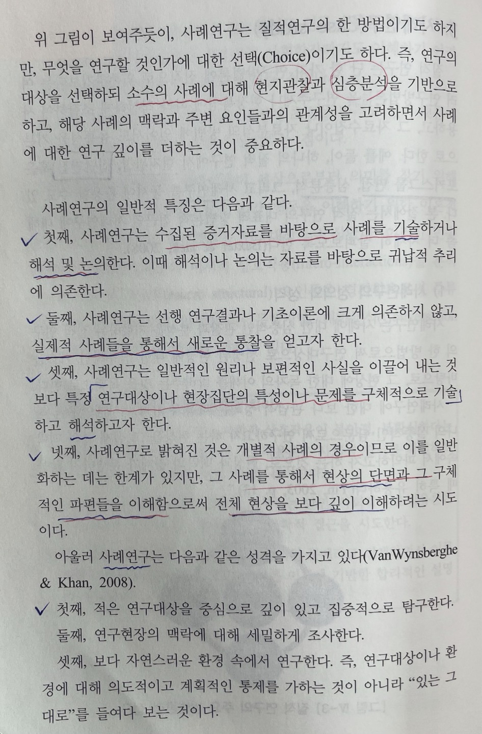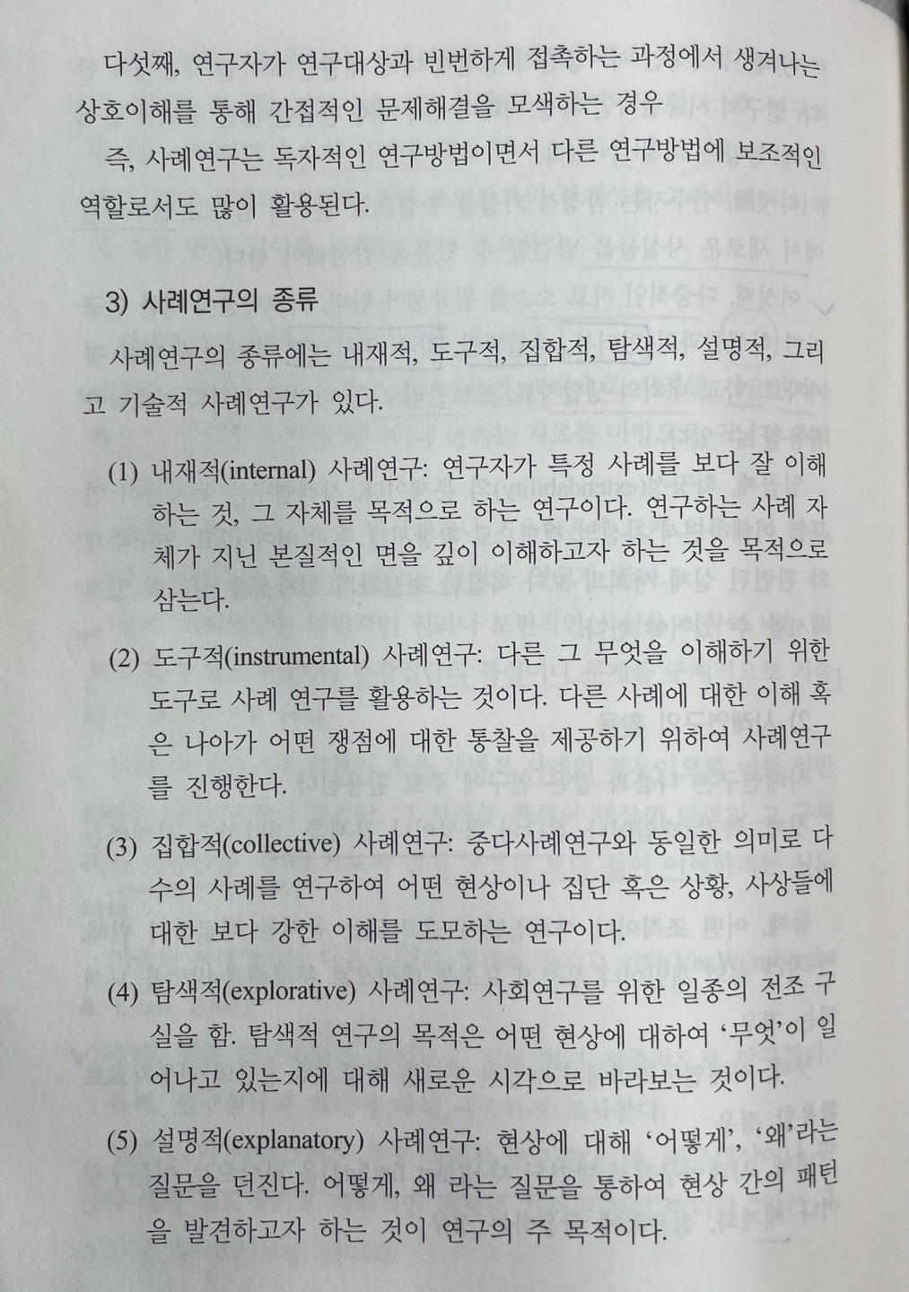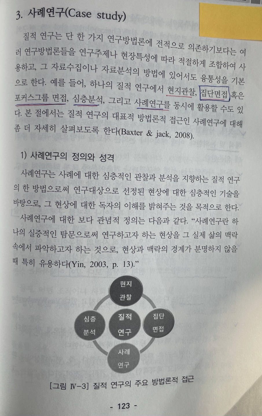 * 사례연구 : 질적 연구는 단 한 가지 연구방법론에 전적으로 의존하기보다는 여러 연구방법론들을 연구주제나 현장특성에 따라 적절하게 조합하여 사용하고, 그 자료수집이나 자료분석의 방법에 있어서도 융통성을 기본으로 한다. 예를 들어, 하나의 질적 연구에서 현지관찰, 집단면접, 혹은 포커스그룹 면접, 심층분석, 그리고 사례연구를 동시에 활용할 수도 있다(Baxter & jack, 2008).