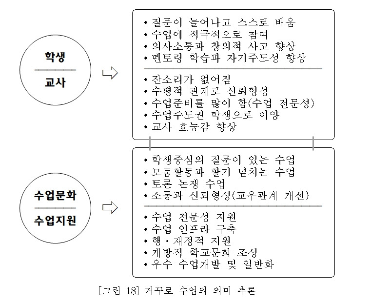 * 수업문화의 변화로 교사와 학생의 긍정적 효과(분위기, 질문이 살아남, 무기력에서 활력, 자기주도적 학습, 학생간 우호적, 협업, 멘토링 학습효과, 토론수업 토론능력 향상, 학생 vs 교사 - 잔소리 사라짐, 래포형성