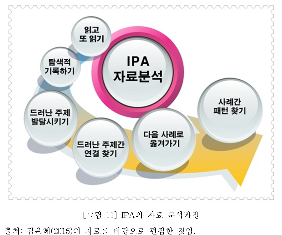 * 해석적 현상학적 분석(IPA: Interpretative Phenomenological Analysis) : ‘자료 읽고 또 읽기 → 탐색적 기록하기 → 드러난 주제 발달시키기 → 주제 간의 연결 찾아내기 → 다음 사례로 옮겨가기 → 사례 간 패턴 찾기’로 진행하면서 분석하는 방법이다.