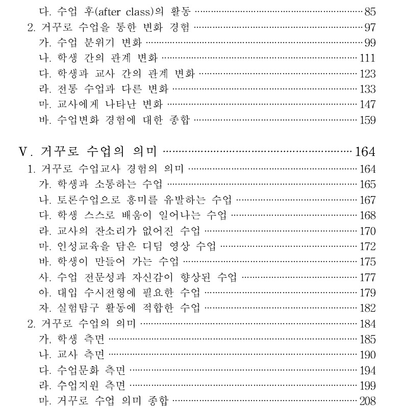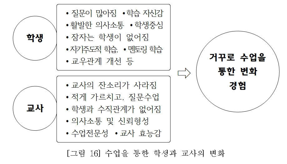 - 거꾸로 수업을 통한 변화 경험(수업분위기, 학생간, 학생교사간, 전통수업과 비교, 교사의 변화, 수업변화 경험 종합)
