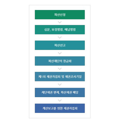 파산절차에서는 파산절차와 관계없이 수시로 변제해야 하는 채권을 재단채권, 파산절차에 따라 배당을 받아야 할 파산채권이 있다. 파산관재인은 그간 회사의 자산을 처분해 현금화한 현금을 가지고 재단채권자에게 지급하고, 파산채권자들에게 채권액에 따라 비율적으로 배당을 하게 된다.