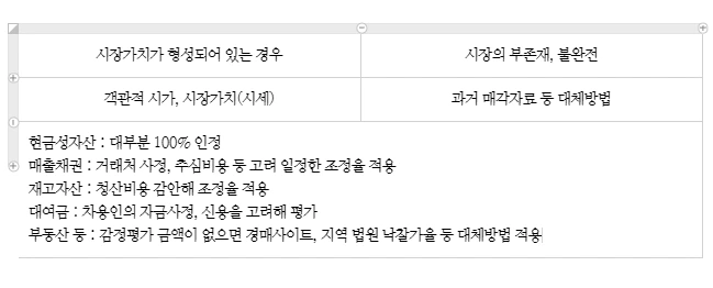 그런데, 분리처분할 수 있는 자산의 유형은 기업별, 개인별로 다양하고 특히 재무상태표상 자산내역을 기준으로 현재 상태와 비교하여 여러 평가적 가정과 요소를 적용해 청산가치를 산정하게 된다.