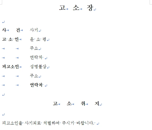 경찰서, 검찰청 등에 가면 고소장 양식을 받을 수 있고, 워드로 작성한다면 일단 제목을 고소장이라고 쓰고, 고소인(피해자)의 성명, 주민등록번호, 주소, 연락처 등을 기재한다. 그 다음에 피고소인(가해자)의 성명, 주민등록번호, 주소, 연락처를 기재한다.
