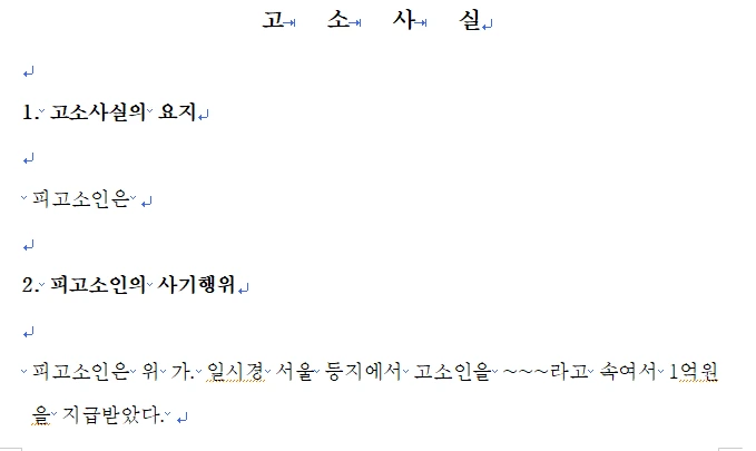 고소인, 피고소인, 죄명, 고소제기 취지 등을 다 기재하였다면 고소이유, 고소를 하게 된 사실관계, 고소원인 등을 정리해서 기재해야 한다. 만약, 사기죄로 고소를 하는 경우 가해자(피고소인, 고소를 제기당한 사람)가 고소인(피해자)과 어떤 관계이고, 어떤 설명과 명목으로 돈이나 재산상 이익을 가져 간 후 약속을 안 지켰는지 등에 대해 설명을 해야 한다.
