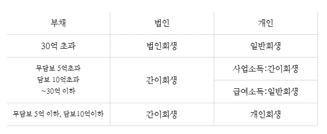 우선 회생제도와 파산제도의 종류부터 보자. 일단, 법인형태인지, 개인인지를 구별하고 채무총액의 구간에 따라 선택해야 하는 회생절차가 다르닥. 그리고, 개인의 경우에는 소득형태가 사업소득인지, 급여소득인지에 따라 회생절차가 다르다.