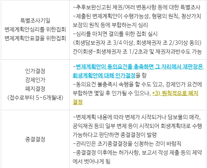 종결결정은 제1차년도 변제가 이루어졌거나 담보물이 매각되는 등으로 회생담보권의 변제가 수행되었거나 조세 등 공익채권의 일부 변제가 되거나 수행가능성이 매우 높다고 평가되면 법원이 종결결정을 내린다. 개인적으로는 일정한 요건이 되면 조기종결신청을 하고 있다.