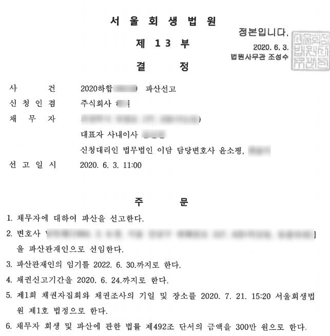 법인파산선고(통상 법인파산, 기업파산 신청서 접수시로부터 1~2개월)
