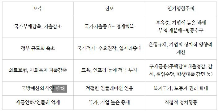 3번째 인기영합주의는 미국에서 있었던 월스트리트 점령운동시에 직접적 정치행동이 주장했던 내용의 요지이다. 위 표 이외에 진보와 보수의 구분적 특징은 더 나열할 수 있는데, 큰 정부 VS 작은 정부의 화두에서 있어서 이 정도면 충분할 듯 하다.