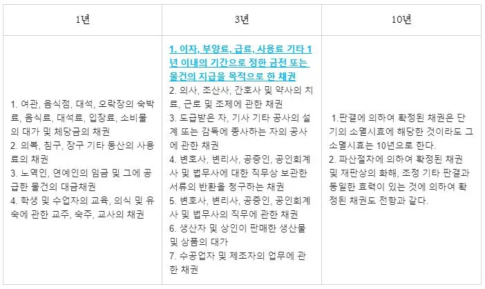 여기서 설명이 필요한 부분은 3년 소멸시효 민법 제163조 제1호 규정인데, 1년 이내의 기간으로 정한 금전, 물건의 지급을 해야 하는 채권은 3년의 소멸시효에 걸린다. 만약, 일반인들 사이(상인, 은행이 아님)에서 A가 B에게 1억원을 빌려주고 월 이자 100만원을 지급받기로 하였다면, 1억원은 10년의 소멸시효에, 이자 100만원은 1년 이내 매월로 지급하기로 한 것이기 때문에 3년의 소멸시효에 걸린다. 이렇게 따져보면 관리비, 월세, 월급 등은 3년의 소멸시효에 걸리는 것이다.