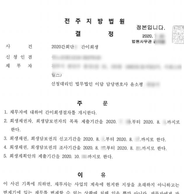 일반회생개시결정문과 달리 아래 개시결정문은 "2020간회단XXXX 간이회생"이라는 사건번호가 부여되는데, 아래 회생절차는 현재 진행 중에 있고, 개업의 회생사건의 회생절차개시결정문입니다. 아! 아래 사건은 전주에서 개업하신 의사선생님 사건입니다.