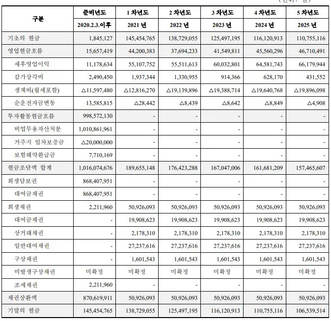 아래 사건은 사업소득자의 회생절차에서 자금수지의 예시입니다. 일반회생절차에서 사업소득자는 담보물의 매각, 영업이익으로 10년간 변제해 나갈 수 밖에 없고, 주식 개념이 없기 때문에 채무를 면제하는 것으로 변제계획을 수립해야 합니다.