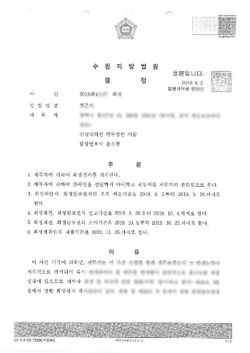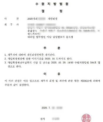 아래 개인회생개시결정문은 수원에 거주하고 있는 직장인의 개인회생신청 사건에서 개시결정된 결정문입니다. 개인회생은 3년 또는 5년 분할변제 후 잔존채무에 대해 면책을 해 주는 회생절차입니다.