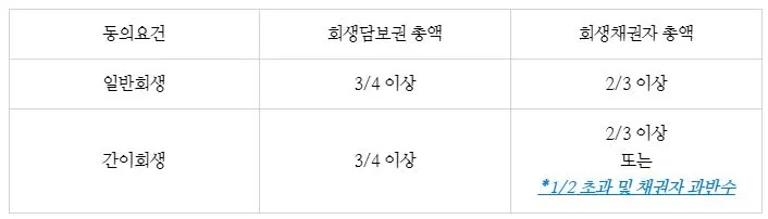 그리고, 일반회생에서는 담보권 총액의 3/4 이상 동의, 무담보권 총액의 2/3 이상 동의를 얻어야 10년분할 및 면제 회생계획안에 대해 법원으로부터 인가결정을 받아 채권자들의 권리를 변경할 수 있습니다.