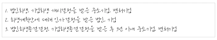 법인회생, 기업회생개시결정을 받거나 회생계획안에 대해 인가결정을 받거나 법인회생종결결정, 기업회생종결결정을 받고 3년 이내에 있는 회사에 대한 지원제도가 새로 시행되니, 법인회생, 기업회생절차를 신청할 이유가 또 하나 생긴 것이다.