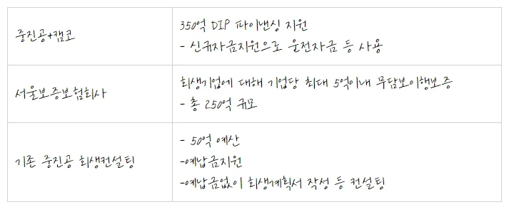 법인회생, 기업회생 대상기업에 대한 신규자금지원 350억+이행보증 250억+중진공 50억 등으로 위 자금범위가 소진되기 전에 지원하는 것이 좋고, 50개사를 대상으로 하고 있으므로 지원을 조속히 검토해 보는 것이 바람직하다.