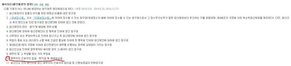 채무자회생법 제473조 제10호를 보면, '채무자(법인파산신청 법인)의 근로자의 임금, 퇴직금 및 재해보상금으로 규정되어 있습니다.