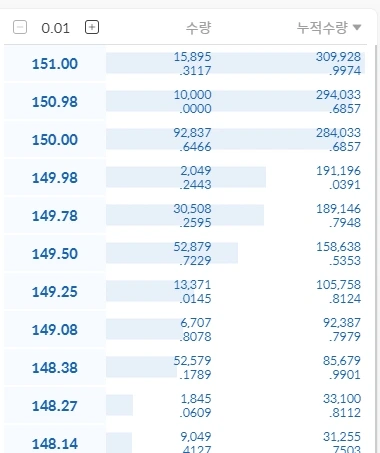 반면, 150원 대 언저리에 매수하고 싶으면 넉넉하게 160대 언저리에 매도벽을 수개 세우고 149이하로 '억'대의 매수벽을 수개 세우면 된다. 그러면 149 초과로 매수예정가액자들이 나타나고 공모자 이외의 매도자들도 160원 미만으로 촘촘하게 매도예정가액을 설정할 것이기 때문에 149 이하의 매수벽을 취소하고 150원대에 있는 매도예정코인들을 주르륵 매수하면 된다.